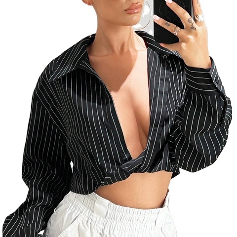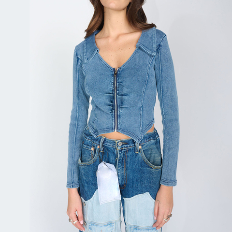 Custom Light Wash Zachte Revers Lange Mouw Uitloper Vrouwen Rits Crop Shirt