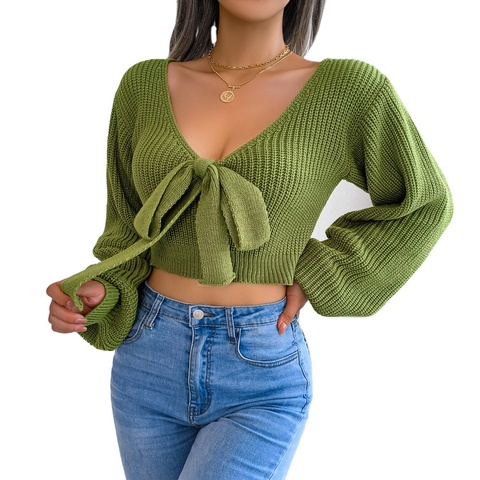 Fabrikant Ontwerp Vrouwen Losse Getailleerde V-Hals Modieuze Gebreide Top Trui Met Strik Lente Herfst Crop Trui Voor Dames
